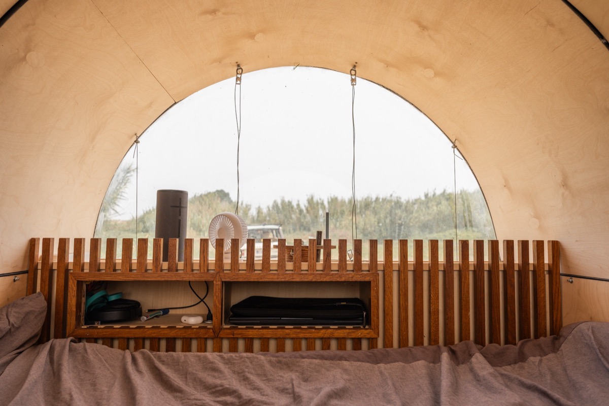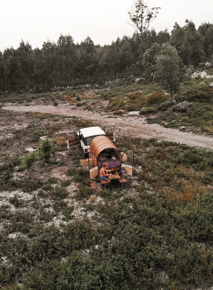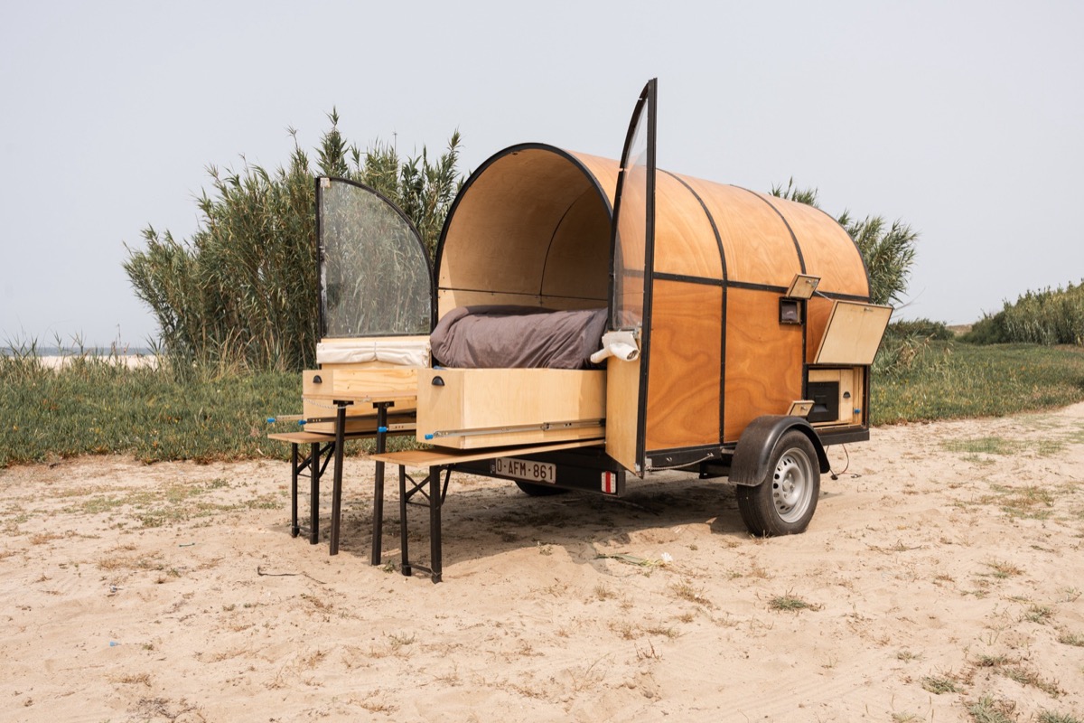 L’aménagement pose question des besoins primaires de l’Humain et propose des solutions compactes. Il privilégie la légèreté : un espace de vie qui se déploie à l’extérieur, un lit, des ouvertures cadrées, un système autonome d’énergie et d’eau conçu pour répondre aux besoins du voyage.