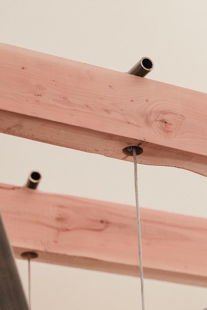 Le choix des matériaux est clair : bruts, réutilisés, durables. Pas de fioritures. Ce que l’on voit, c’est ce que c’est. Pas de vis non plus. Chaque élément s’assemble mécaniquement. Chaque assemblage est étudié pour fonctionner mécaniquement. La structure est isostatique : stable par nature.