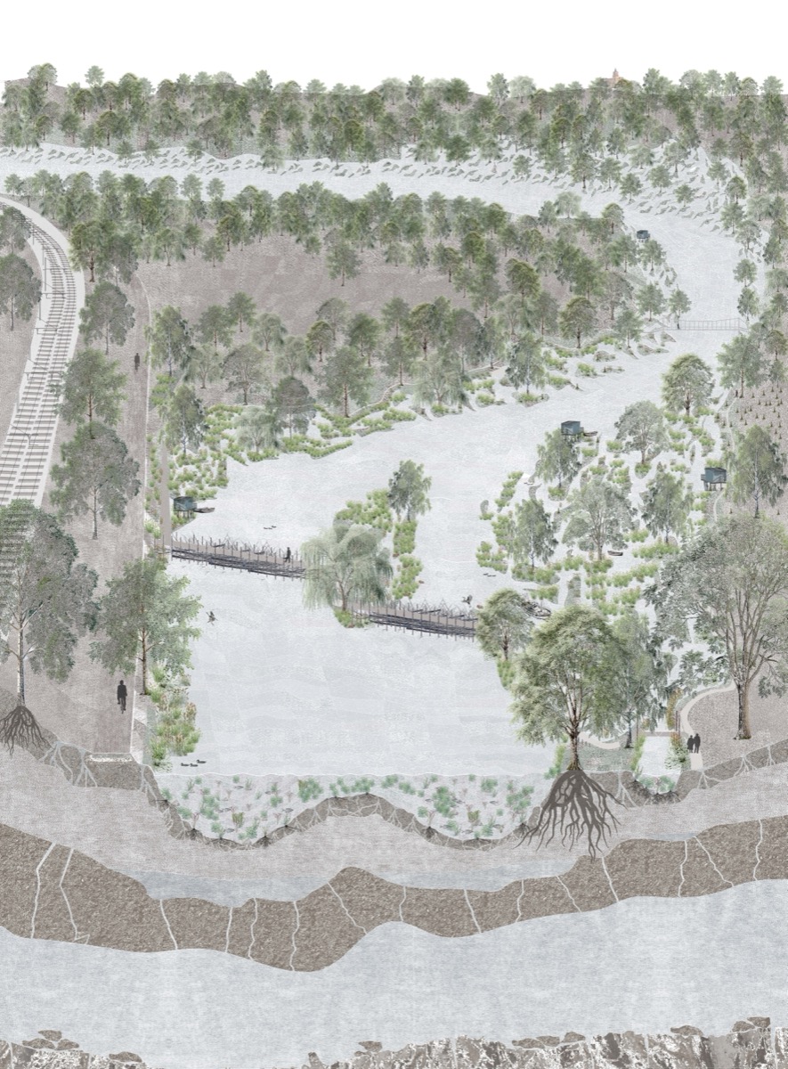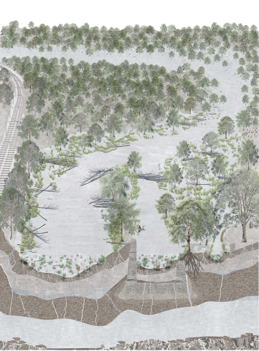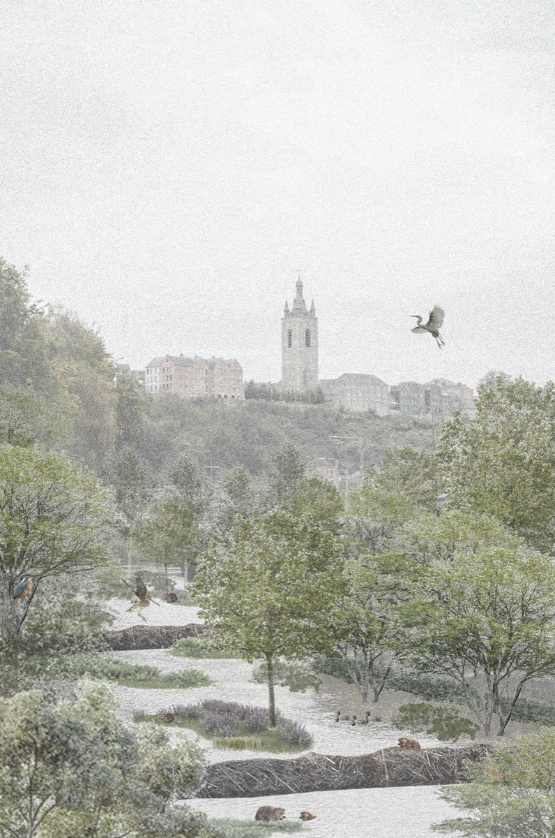La Sambre, jadis moteur de la révolution industrielle, est aujourd’hui un paysage oublié, enfermée entre des murs de béton et déconnectée de sa faune et sa flore. Le projet explore différentes manières de gérer les flux de la rivière et de ses affluents pour la reconnecter à son territoire.
